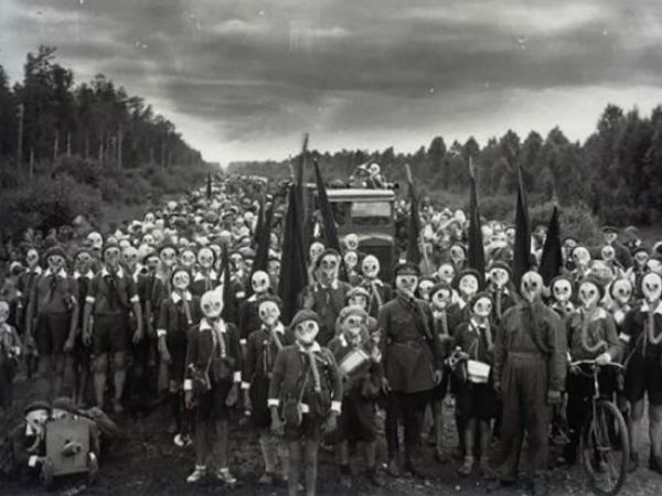 ஒரு பெரும் கூட்டத்தினர் அனைவரும் கேஸ் மாஸ்க் முடமூடி அணிந்து எடுத்துக் கொண்ட க்ரூப் போட்டோ இது.