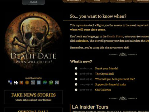 நீங்கள் எப்போது இறப்பீர்கள் என என்றாவது யோசித்ததுண்டா? இங்கே கேட்கப்படும் கேள்விகளுக்கு நீங்கள பதில் கூறுங்கள், இந்த தளம் உங்களது இறப்பு எப்போது நிகழ்வும் என கூறும். மேலும், உங்கள இறப்பு எதை சார்ந்து, எப்படியாக அமையும் என்றும் இந்த தளம் கூறும்.