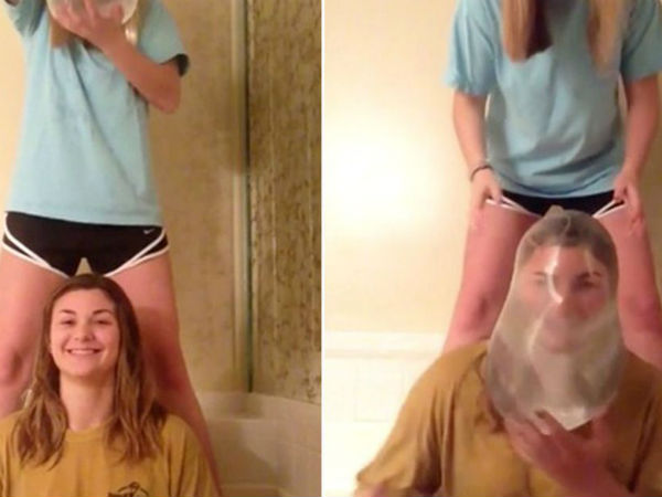 காண்டத்தில் தண்ணீரை நிரப்பி அதனை ஒருவர் தலையில் போட்டால் காண்டத்தால் முகமுடி அணிந்தது போல ஆகிவிடுகிறது, இதனை வீடியோவாக எடுத்து சமூகவலைதளத்தில் பகிர்ந்தனர்.