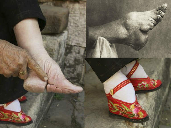 சீனாவில் பின்பற்றப்படும் விசித்திரமான நடைமுறை இது. இளம்பெண்களின் கால்களை 4 அல்லது ஐந்து வருடங்கள் கட்டி வைப்பாரக்ள். அவர்கள் பாதம் வளரக்கூடாது என்பதற்காக. இப்படிச் செய்வதால் கெட்ட சக்திகள் அண்டாது, மத நம்பிக்கை, போன்றவை எல்லாம் அல்ல, அழகுக்காக இப்படிச் செய்கிறாரக்ள்.