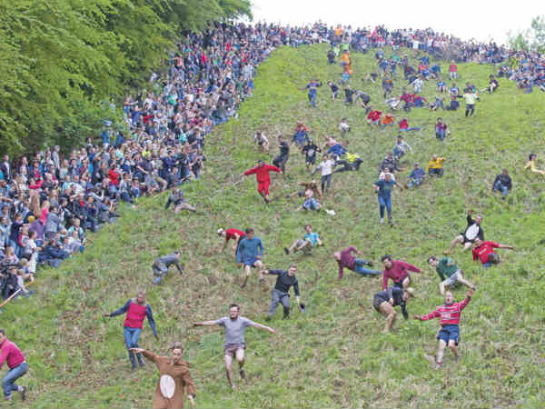 இங்கிலாந்தில் கிடைக்க கூடிய கடினமான சீஸ் வகைகளில் ஒன்றை சறுக்கலான மலை உச்சியிலிருந்து கீழே உருட்டி விடுகிறார்கள். அதனைப் பிடிக்க பலரும் முண்டியடித்துக் கொண்டு ஓடிவருகிறார்கள். மலை உச்சியிலிருந்து மிகம் சறுக்கலான பாதையாக இருப்பதால் பலருக்கும் காயம் ஏற்படுவது சகஜம்.