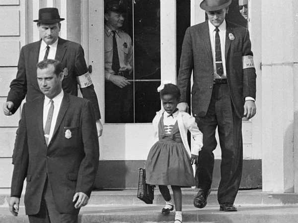 1960, நவம்பர் 14 ஆம் தேதி முதன் முதலாக கறுப்பினத்தவர்கள் வரலாற்றிலேயே முதன்முறையாக வெள்ளையர்கள் படிக்கும் பள்ளிக்கும ரூபி செல்லவிருக்கிறார். வீட்டிலிருந்து ஐந்து தெரு தள்ளியிருந்த பள்ளிக்கு காரில் அழைத்து வரப்பட்டார்.ரூபிக்கு பாதுகாப்பு வழங்க நான்கு படைத்தளபதிகள் வந்திருந்தார்கள்.இருவர் முன்னாலும் இருவர் ரூபிக்கு பின்னாலும் வந்தார்கள். இவர்களுடன் ரூபியின் தாயும் உடனிருந்தார்.