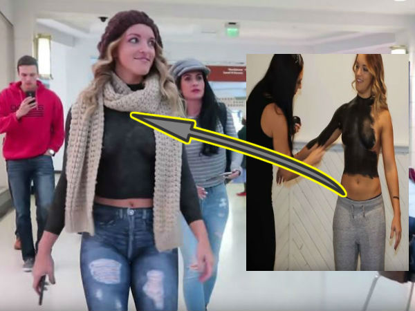 நிஜமான உடை என்று அவர்கள் அந்த மாடலுக்கு உடுத்த கொடுத்தது என்பது தாங் வகை உள்ளாடை மற்றும் ஸ்கார்ப் மட்டும் தான். மற்றபடி, இந்த பாடி பெயிண்டிங் முடிந்து, அந்த மாடலை ஒரு மாலுக்கு அழைத்து சென்று ஜாலியாக வந்த போது அவர் ஏறக்குறைய 95% நிர்வாண உடலுடன் தான் இருந்தார்.