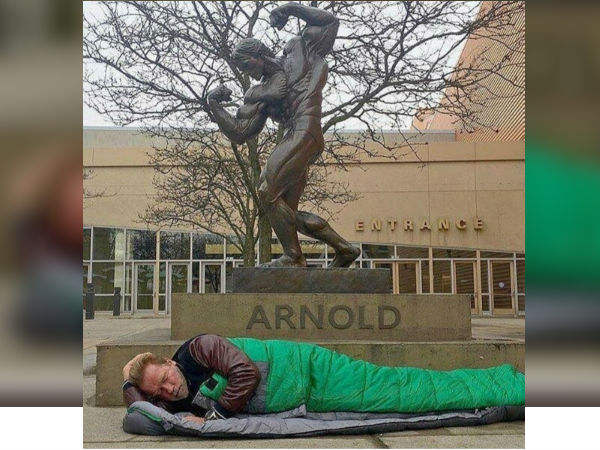 தன்னுடைய வெண்கலச் சிலைக்கு முன் உறங்கிய புகழ்பெற்ற ஹாலிவுட் ஹீரோ (Arnold Schwarzenegger) அர்னால்டின் பரிதாப நிலை...