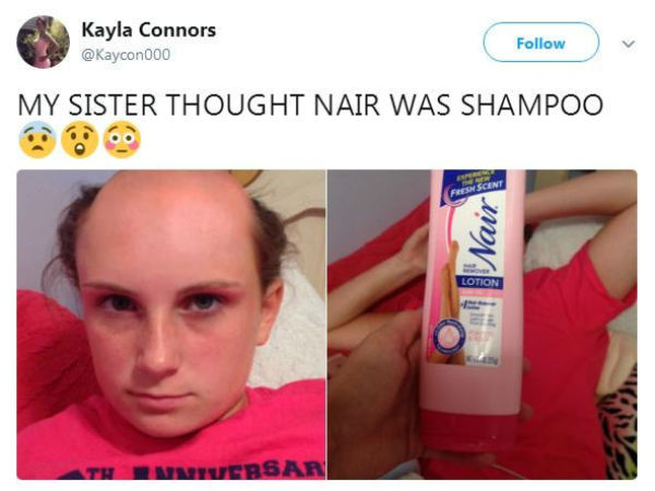 அதாச்சும் ரெண்டு, மூணு நாள் சாப்பிடும் போதுதான் உறுத்தலா இருந்திருக்கும். இங்க இந்த பொண்ணு பண்ணியிருக்க வேலைய பாருங்க. தங்கச்சியோட ஹேர் ரிமூவர் க்ரீம் எடுத்து ஷாம்பூனு நெனச்சு நல்ல தேச்சு குளிச்சிருக்கு. அழுக்கு போச்சோ இல்லையோ, தலையில இருந்த முடி எல்லாம் கொட்டிப் போச்சு....