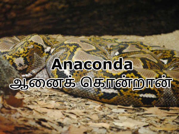 ஆனைக் கொன்றான் - Anaconda - இதற்கு யானை கொல்பவன் என்ற பொருளும் இருக்கிறது. உலகின் பெரிய பாம்பு வகையாக கருதப்படும் அனகோண்டா ஆனது ஆனை கொன்றான் என்ற தமிழ் சொல்லில் இருந்து மருவிய சொல்லாகும். இது உலகிலேயே பெரியவகை, நீளமான பாம்பு என்று கருதப்படுகிறது. இதற்கு பெரிதாக நச்சுத்தன்மை இல்லை என்றாலும், இது ஒரு ஆளையே சுருட்டி, இறுக்கி கொண்டு விழுங்கும் தன்மை கொண்டுள்ளதாகும். அமேசான் ஆற்றில் வாழ்கிறது என்றும் கருதப்படும் இந்த பாம்புகள், மீன்கள், கோழி, ஆடுகள், குதிரை போன்றவற்றை உண்ணும்.