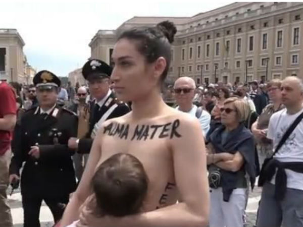 வாட்டிகன் நகரின் செயிண்ட் பீட்டர் சதுரத்தில் மேலாடை இன்றி தாய் பாலூட்டி போராட்டம் நடத்தி காவலர்களால் பெண் போராளி கைது செய்யப்பட்டு அழைத்து செல்லப்படும் காணொளிப்பதிவு. இந்த வீடியோ பதிவு மேற்கத்திய நாடுகளில் சமூக தளங்களில் வைரலாக பரவி வருகிறது.