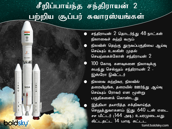 ஜூலை 15 ஆம் ஆததி அனுப்புவதாகத் திட்டமிடப்பட்ட சந்திராயன் 2 சில தொழில்நுட்பக் கோளாறு காரணமாக விண்ணில் ஏவப்படாமல் நிறுத்தி வைக்கப்பட்டது. அது இன்று மதியம் வெற்றிகரமான சந்திரனுக்கு அனுப்பப்பட்டது. அந்த சந்திராயன் 2 பற்றிய பல்வேறு சுவாரஸ்யமான விஷயங்களைப் பற்றித் தான் இந்த கட்டுரையில் உங்களிடம் பகிர்ந்து கொள்கிறோம். படித்துத் தெரிந்து கொள்ளுங்கள்.
