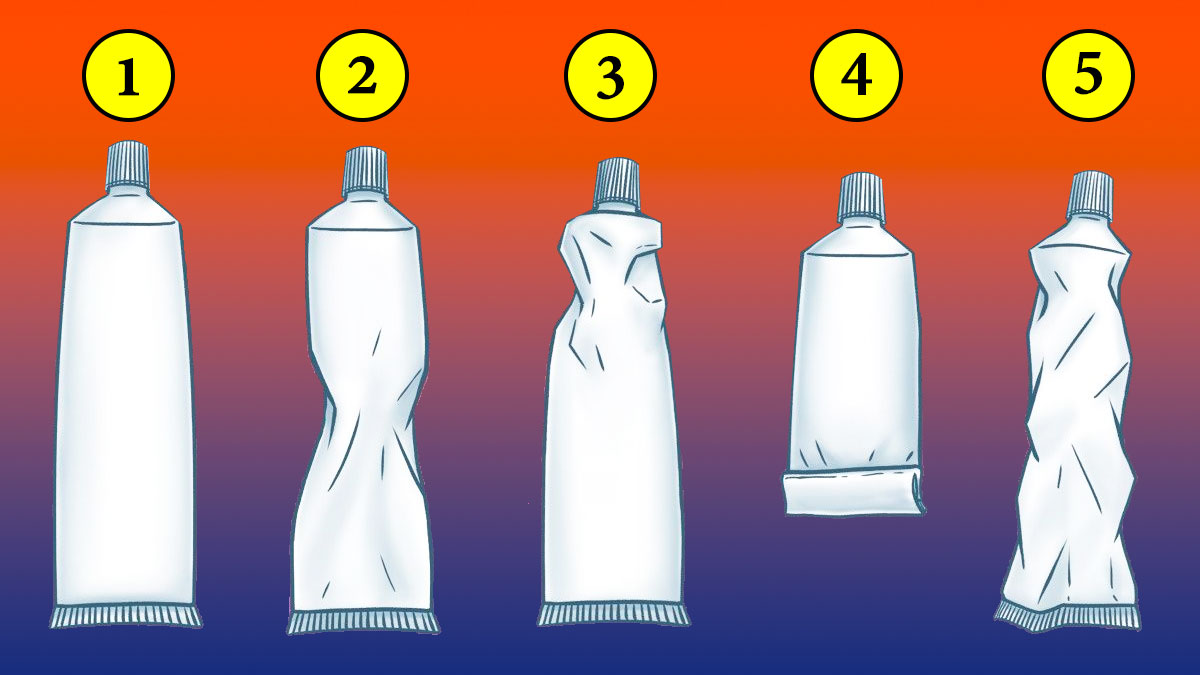 நீங்கள் படத்தில் காட்டப்பட்டவாறு டூத் பேஸ்ட்டை புதிது போன்றே வைத்து பயன்படுத்துவீர்களா? அப்படியானால் நீங்கள் தனிமையை அதிகம் விரும்புவீர்கள். நிறைய கனவு காண்பீர்டகள். கலைநயமிக்கவர். சில சமயங்களில் நீங்கள் ஒரு தனி கற்பனை உலகில் வாழ்வீர்கள். மிகவும் சென்சிடிவ்வானவர், மென்மையானவர், எளிமையானவர், அக்கறையுள்ளவர் மற்றும் சகிப்புத்தன்மை அதிகம் கொண்டவர். அதே சமயம் எதையும் வெளிப்படையாக பேசக்கூடியவர். உங்களின் எண்ணங்களை மற்றவர்களுடன் பகிர்ந்து கொள்வீர்கள்.