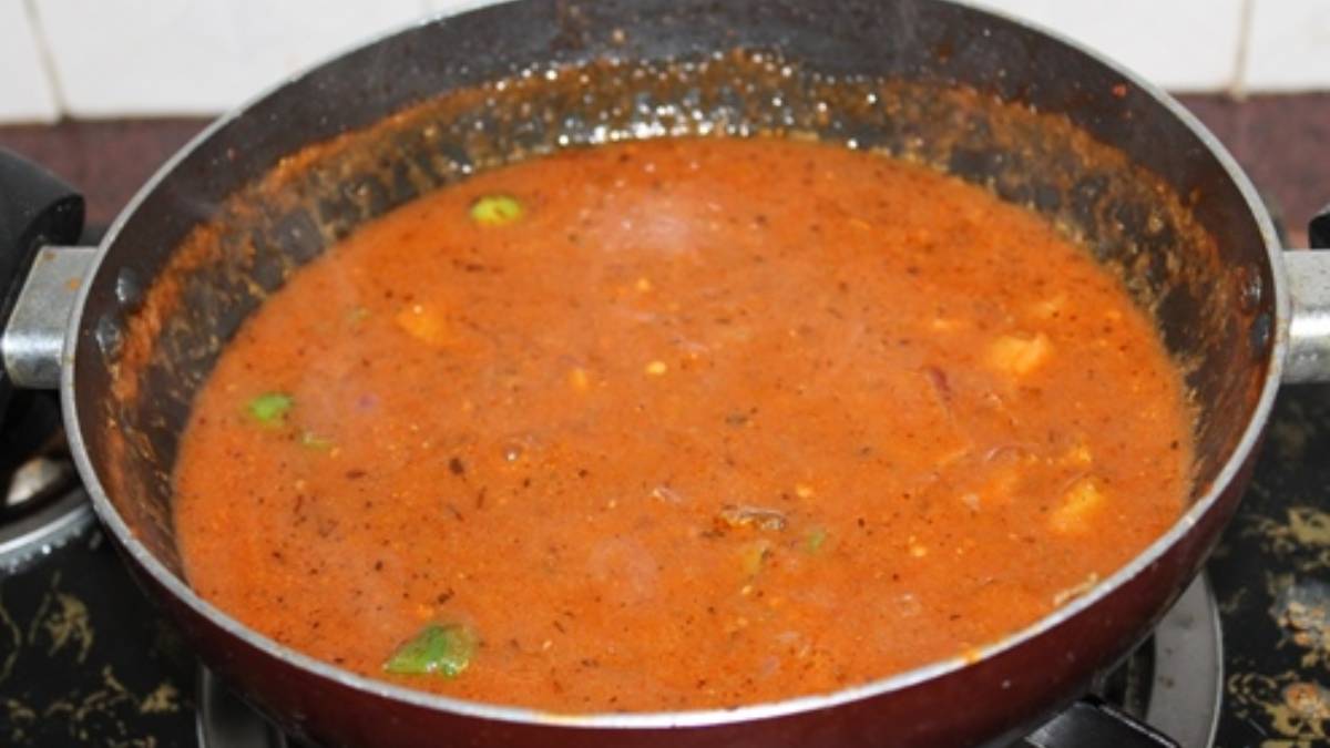 * அடுத்து அதில் அரைத்த தக்காளியை ஊற்றி நன்கு கிளறி, மூடி வைத்து எண்ணெய் பிரியும் வரை வேக வைக்க வேண்டும்.