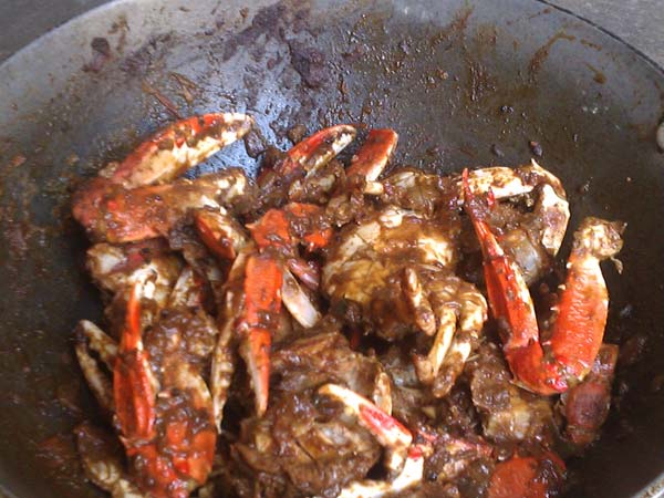 பின்னர் அதில் தண்ணீர் ஊற்றி பிரட்டி, தண்ணீர் சுண்டும் வரை அடுப்பில் வைத்து நண்டுகளை வேக வைக்க வேண்டும்.