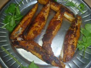 மீனை தலையை நீக்கி சுத்தம் செய்து கொள்ளவும். நன்றாக தண்ணீரில் அலசி நீரை வடித்து மீனை உலர்வாக வைக்கவும். பின்னர் மிளகாய்த்தூள், உப்பு, இஞ்சி, பூண்டு, எலுமிச்சை சாறு சேர்த்து நன்றாக பிசிறிவிடவும், பின்னர் கார்ன்ப்ளவர் சேர்த்து கலக்கவும். ஒருமணி நேரம் ஊறவிடவும்.