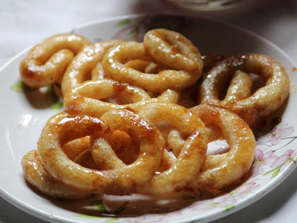 பின்பு தனியாக வைத்துள்ள மாவை ஒரு கெட்டியான பாலிதீன் கவரில் சிறிது வைத்து, அந்த கவரில் முறுக்கு போன்று வரும் அளவில் ஓட்டை போட்டு, எண்ணெய் சூடானதும், அதில் வட்ட வட்டமாக பிழிந்து விட்டு, பொன்னிறமானதும், அதனை எடுத்து கருப்பட்டி பாகுவில் போட்டு 2 நிமிடம் முன்னும், 2 நிமிடம் பின்னும் திருப்பிப் போட்டு ஊற வைத்து எடுக்க வேண்டும்.