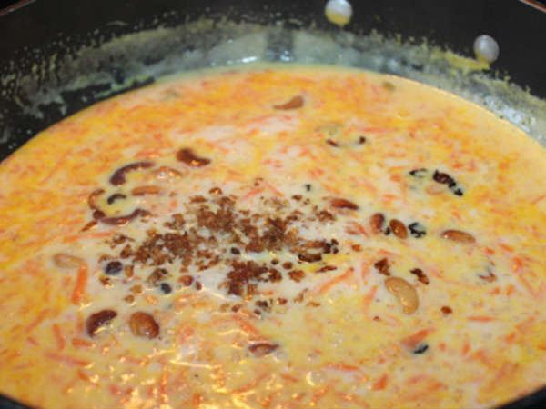 பாலானது நன்கு கொதிக்க ஆரம்பித்ததும், தீயை குறைவில் வைத்து, 15 நிமிடம் கேரட்டை நன்கு மென்மையாக வேக வைக்க வேண்டும்.