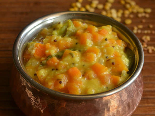 பின்னர் அதனை குக்கரில் போட்டு, அத்துடன் துவரம் பருப்பு, 1 கப் தண்ணீர், உப்பு மற்றும் மஞ்சள் தூள் சேர்த்து அடுப்பில் வைத்து, 2 விசில் விட்டு இறக்கி, மசித்து தனியாக வைத்துக் கொள்ள வேண்டும்.