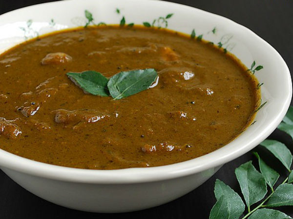 அடுத்து அதில் புளி சாற்றினை ஊற்றி, அத்துடன் கறிவேப்பிலை பேஸ்ட், மஞ்சள் தூள், உப்பு, சாம்பார் பொடி சேர்த்து, தேவையான அளவு தண்ணீர் ஊற்றி, எண்ணெய் தனியாக பிரியும் வரை (குறைந்தது 15 நிமிடம்) நன்கு கொதிக்க விட வேண்டும்.