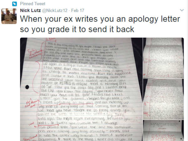 ஏமாற்றிவிட்டு மன்னிப்பு கடிதம் அனுப்பிய காதலி, ட்விட்டரில் மானத்தை வாங்கிய காதலன்!